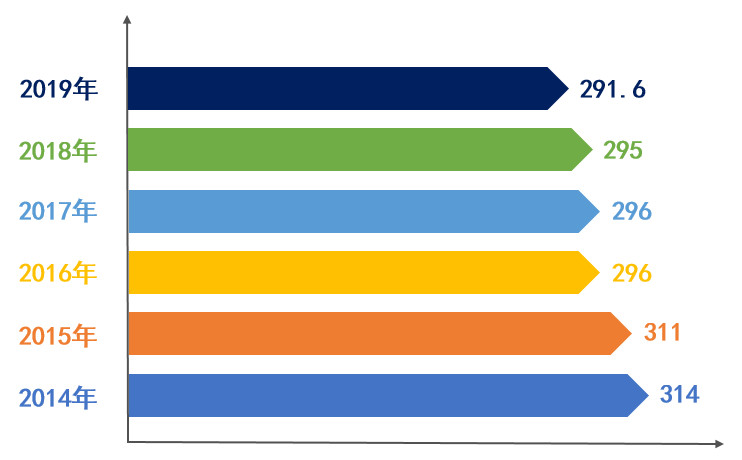 濱化股份2014—2019年燒堿綜合能耗(單位:kg標煤/噸)